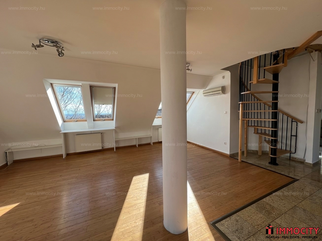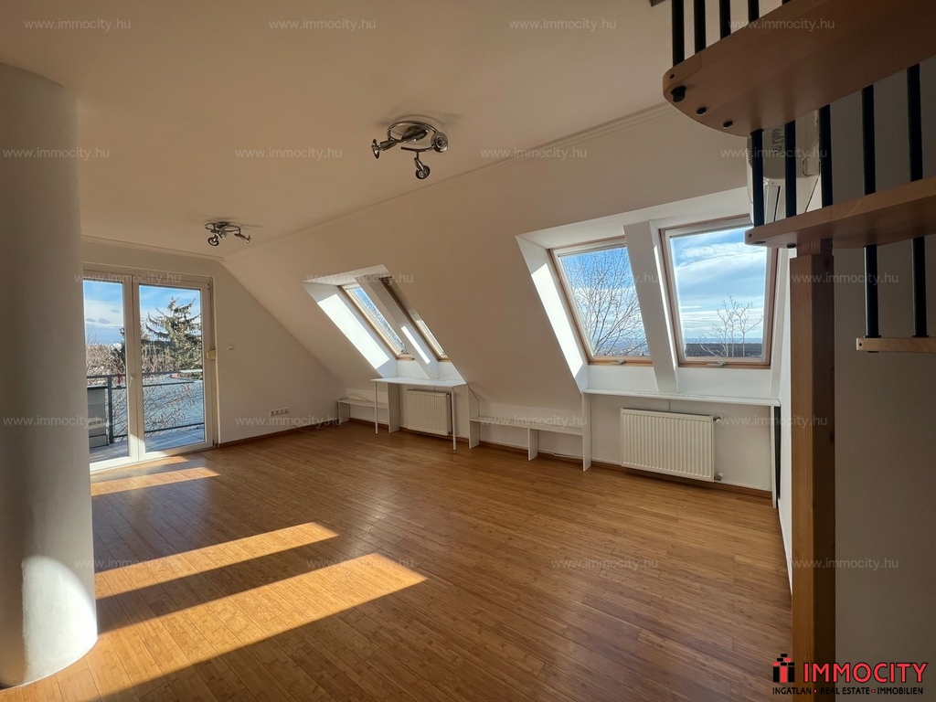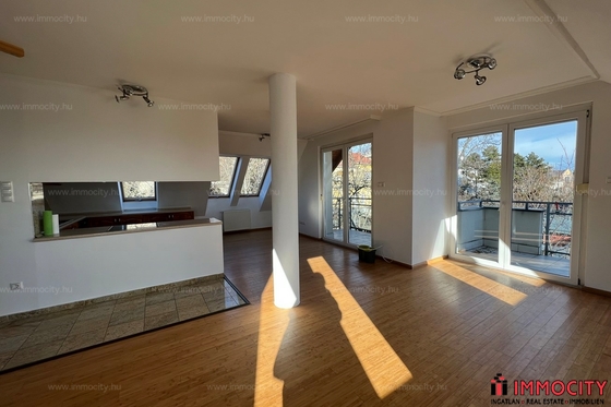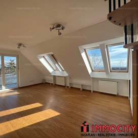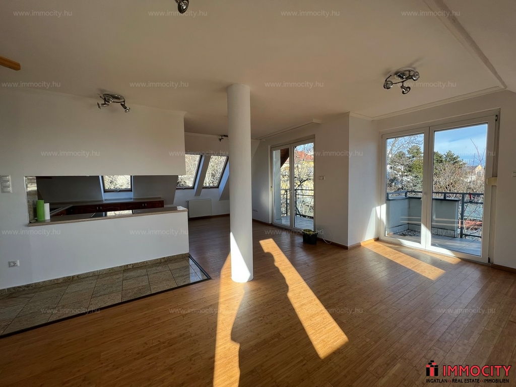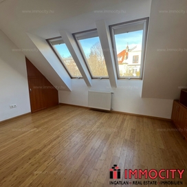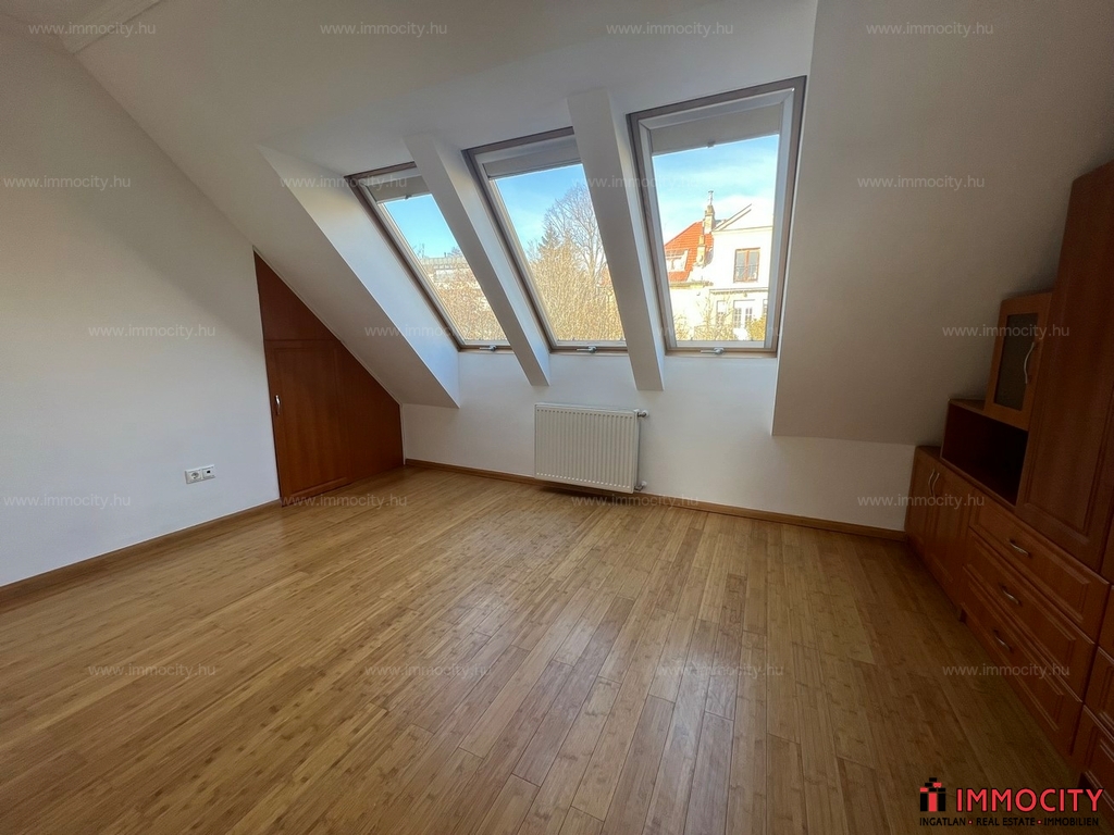 2012-ben épült modern, 7 lakásos, liftes társasház teljes legfelső emeletét elfoglaló lakás 2 terasszal bérelhető. Az eredetileg is szép, tágas lakást a tetőtérben 2 szobával és egy harmadik kis fürdőszobával bővítették ki. (Ez vendégszobának, irodának, gyermek birodalomnak egyaránt ideális). Az egész lakásban remekül hasznosíthatóak az alacsonyabb falsík-területek is. A két erkély 8 és 9 m2-esek. A lakás szép, világos, körbe süti a nap, a két fürdőszoba is ablakos.