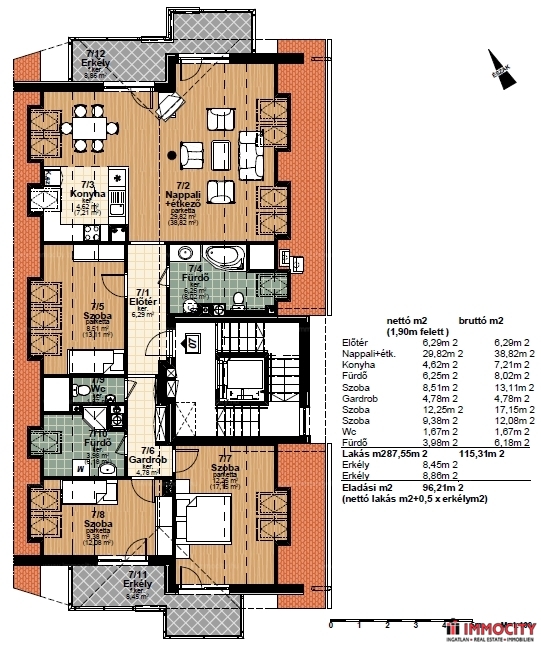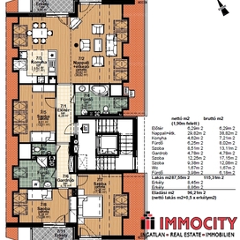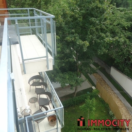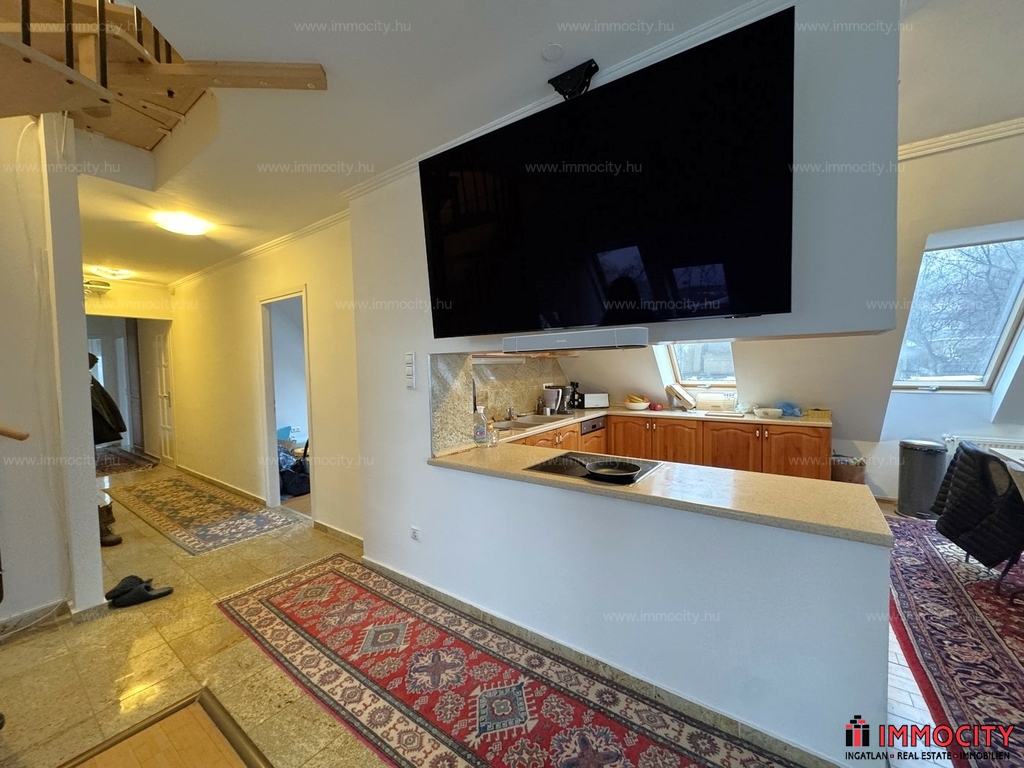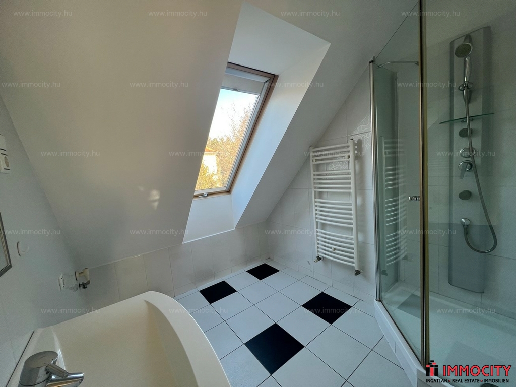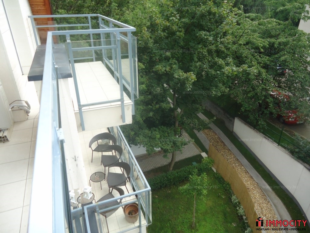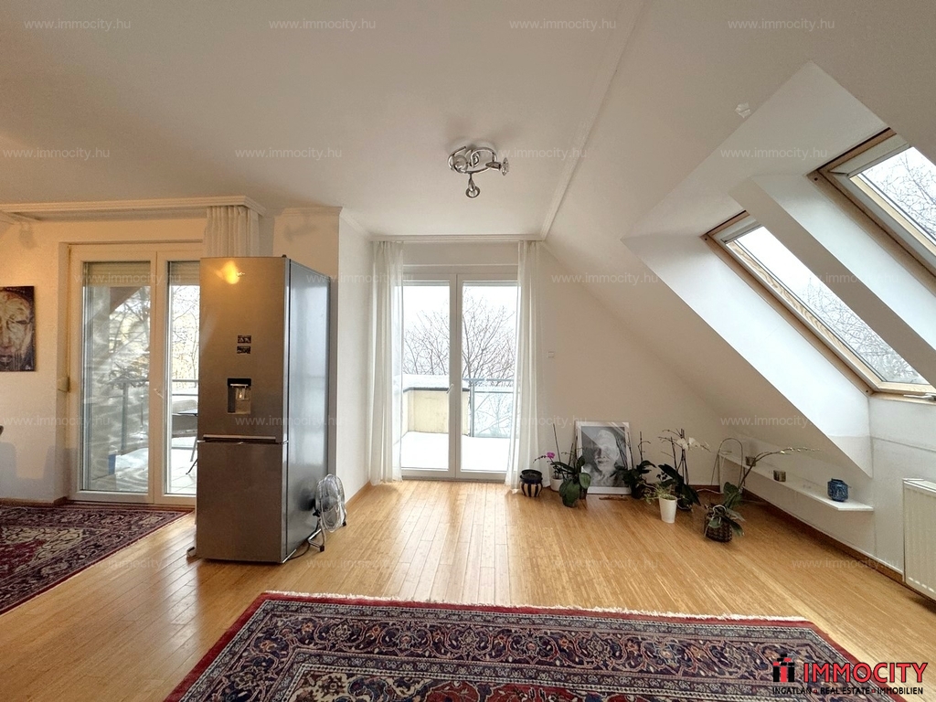 2012-ben épült modern, 7 lakásos, liftes társasház teljes legfelső emeletét elfoglaló lakás 2 terasszal bérelhető. Az eredetileg is szép, tágas lakást a tetőtérben 2 szobával és egy harmadik kis fürdőszobával bővítették ki. (Ez vendégszobának, irodának, gyermek birodalomnak egyaránt ideális). Az egész lakásban remekül hasznosíthatóak az alacsonyabb falsík-területek is. A két erkély 8 és 9 m2-esek. A lakás szép, világos, körbe süti a nap, a két fürdőszoba is ablakos.