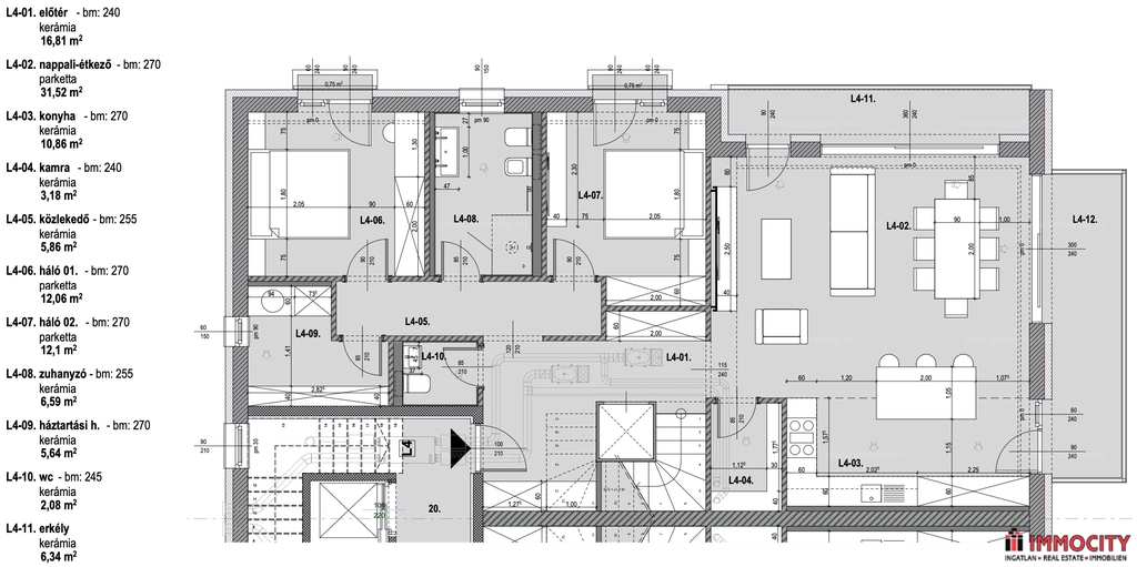A belső kétszintes 5 szobás lakás 150 m2 alapterületű és összesen 46 m2 terasszal rendelkezik.