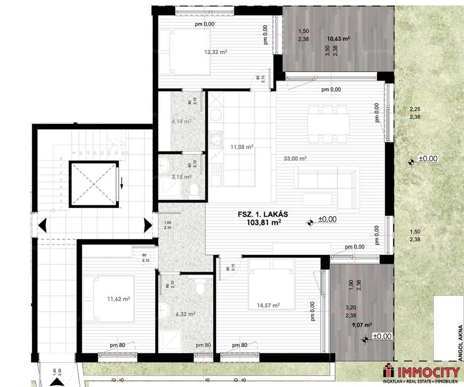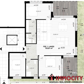A földszinti 4 szobás lakás 101,67 m2 alapterületű, 25 m2-es terasszal és 80 m2-es kizárólagos használatú kertrésszel rendelkezik.