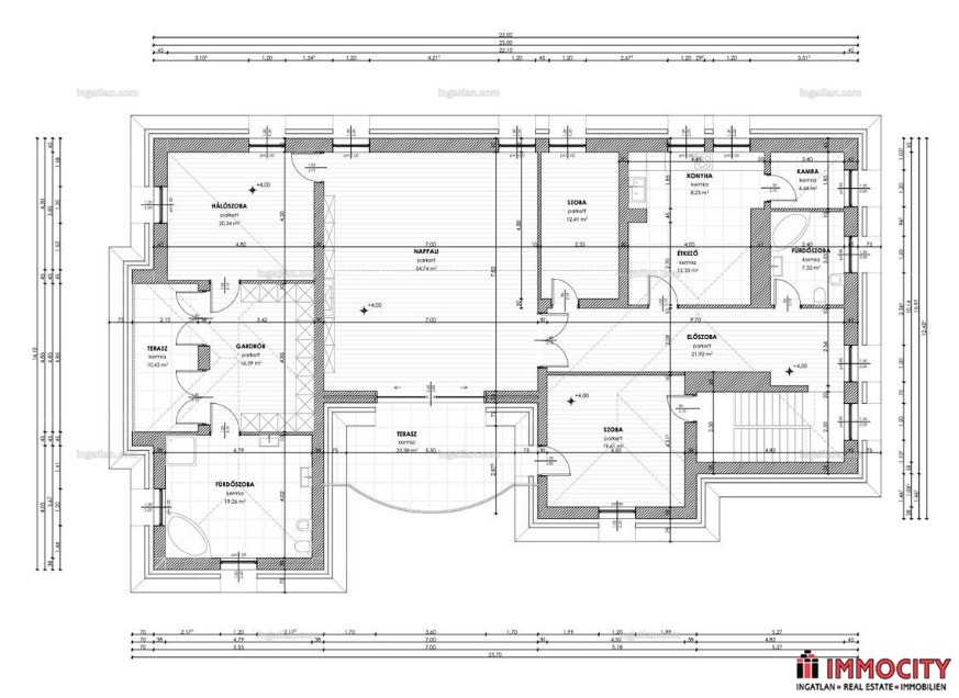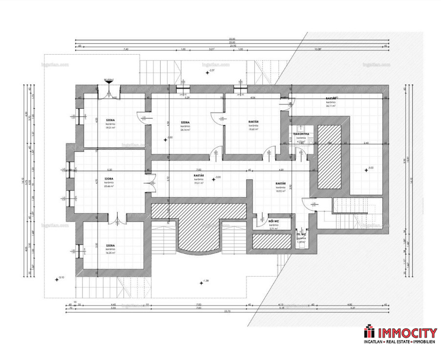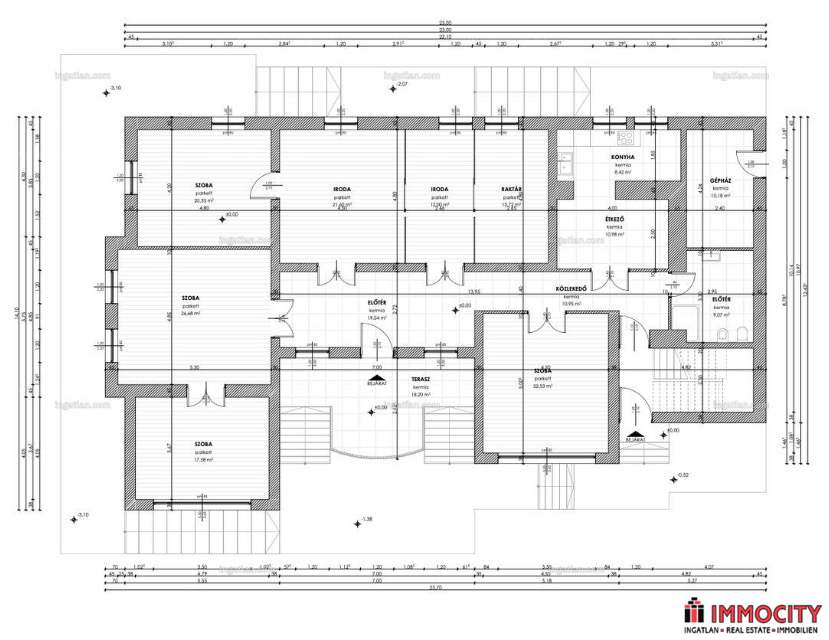 A 3 szint egy belső lépcsőházzal átjárható, ugyanakkor szintenként leválasztható, 3 külön bejárattal is rendelkezik. Földszinten nagy előtér, 5 szoba (némelyik egybenyitható), fürdőszoba, konyha és vendégmosdó. Emeleten elegáns nagy tér kandallóval és 2 tágas teraszzal, 3 szoba, 2 fürdőszoba és konyha található. Alagsorban 6 nagy szoba, férfi és női wc külön és egy teakonyha, külön bejárattal is rendelkezik.