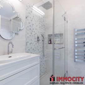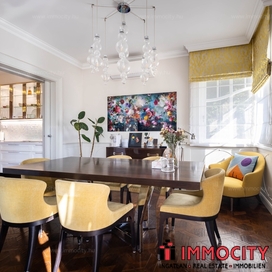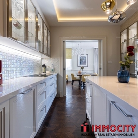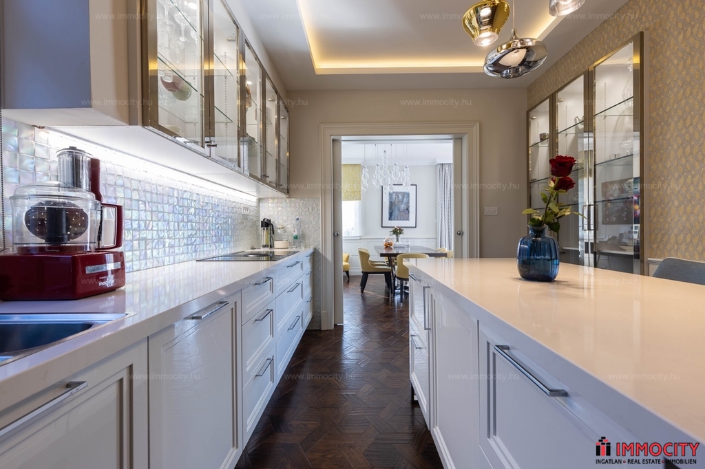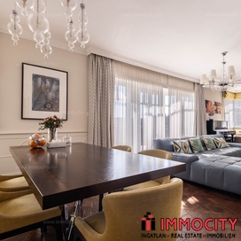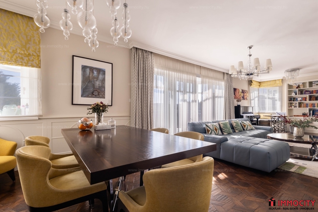 A nagyobbik, 163m2-es belső kétszintes, teraszos lakás nappali-ebédlő-konyha együttese különös eleganciát sugároz, mind adottságát tekintve, mind a beépített bútorok és kiegészíő berendezések tekintetében. A konyha - bár diszkréten szeparált a nappalitól - de stílusával, az egyedi design-nal harmonikusan kapcsolódik a lenyűgöző élettérhez. A felső szinten található 3 hálószobához elegáns, ablakos fürdőszobák tartoznak, külön garderobe és háztartási helyiség.